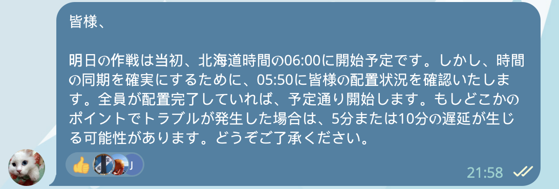 和北海道再次确认了一下时间。4点50进行状态确认,如果全员就位,则正式开始,否则顺延。