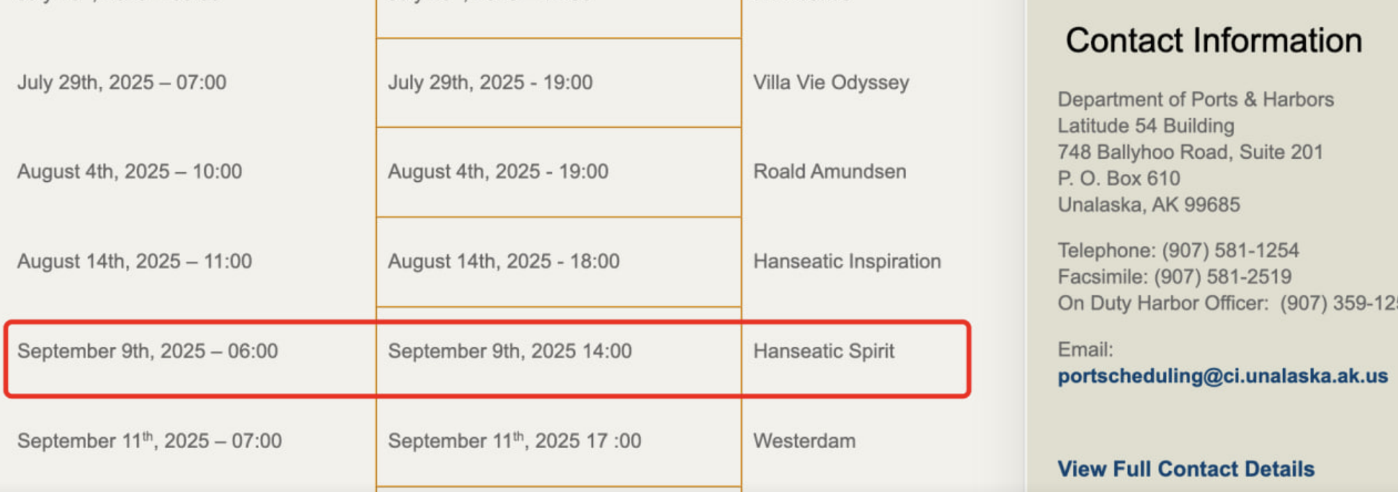 搜到这个邮轮的登陆时间,好,那行动时间就以此为准了。